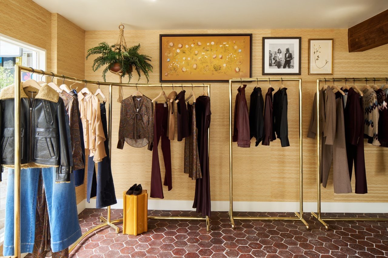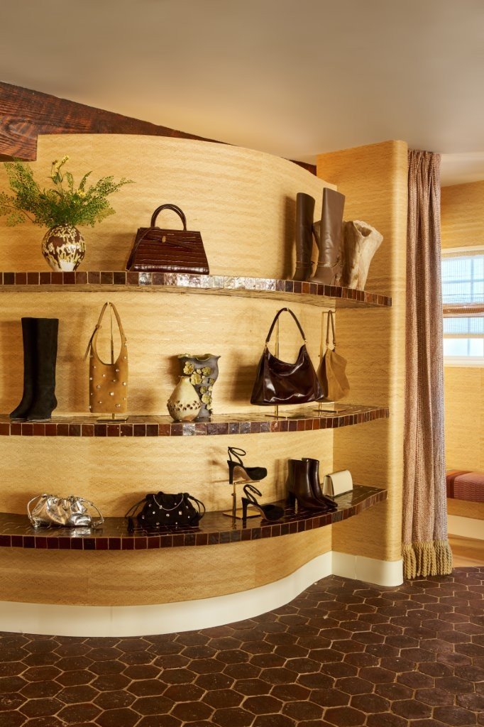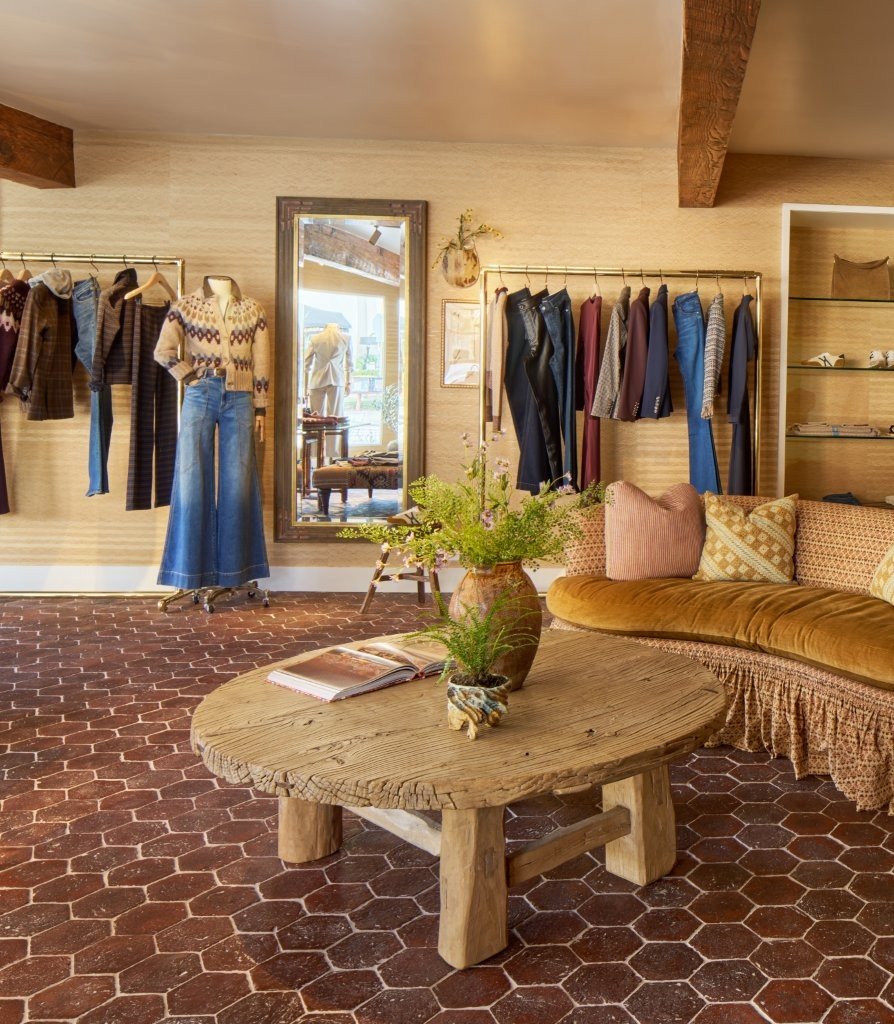 Located on the iconic Coast Village Rd, the store features terracotta flooring and braided raffia wallpaper throughout, bringing warmth and texture to the space. Upon entry, guests are greeted by a vintage McGuire octagonal table styled with a locally sourced vintage pot. The seating area includes a custom two-tone skirted sofa—upholstered in linen with velvet cushions—paired with a vintage wood coffee table for a collected look. A vintage wood console serves as the denim display, while curved glazed-tile shelves showcase accessories. The fitting rooms feature playful floral wallpaper that ties into the store’s personality, while herbarium artwork, vintage copper accents, and painted sculptural pieces imbue charm and individuality.