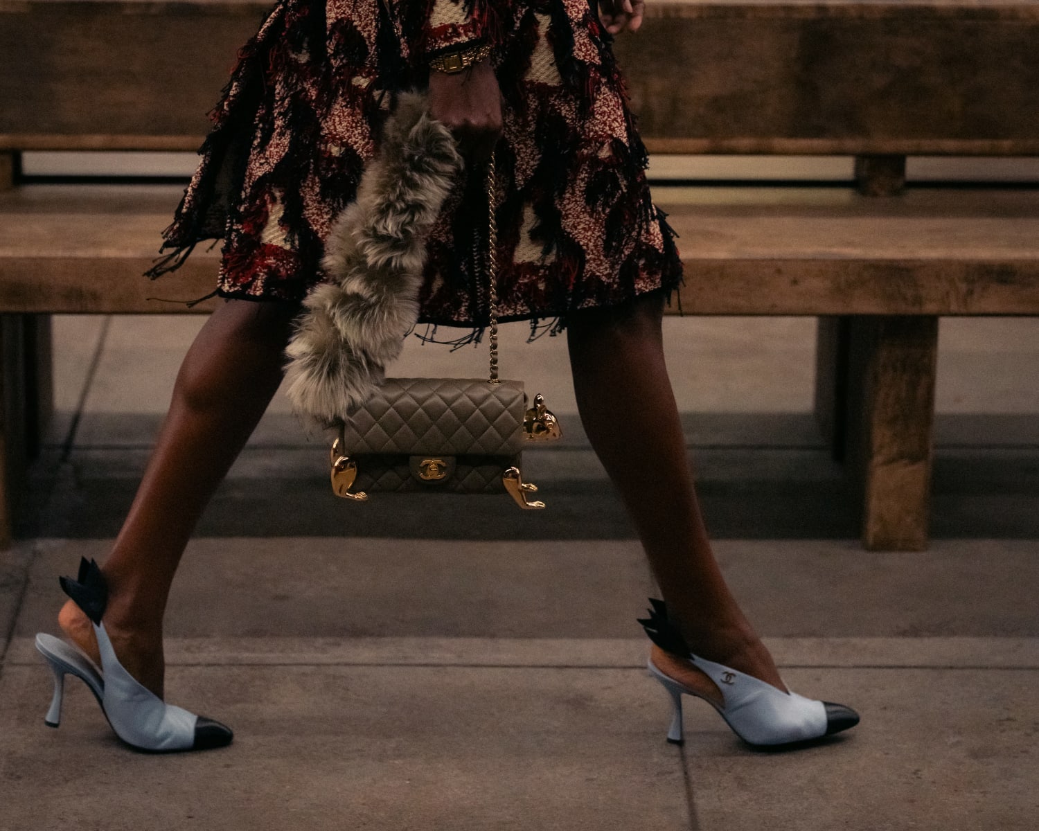 In this amalgam of elevated craft and pop culture, an elegantly witty high-style occurs. ‘Lingerie denim’ is combined with complex embroideries, evoking a new kind of western wear; an archive Art Deco dress is reconfigured and embroidered by Lesage with fringed feather work by Lemarié – this new school flapper chooses to wear hers with illusion chinos; the motif of the men’s shirt is once more revisited and weighted with a Chanel chain, this time lumberjack flannel is evoked in a sumptuous wool boucle tweed.