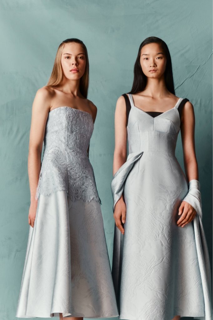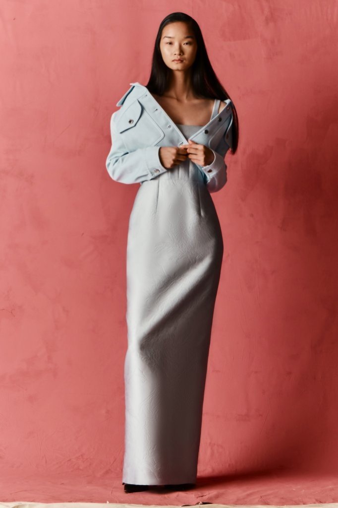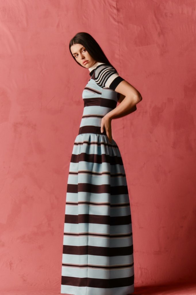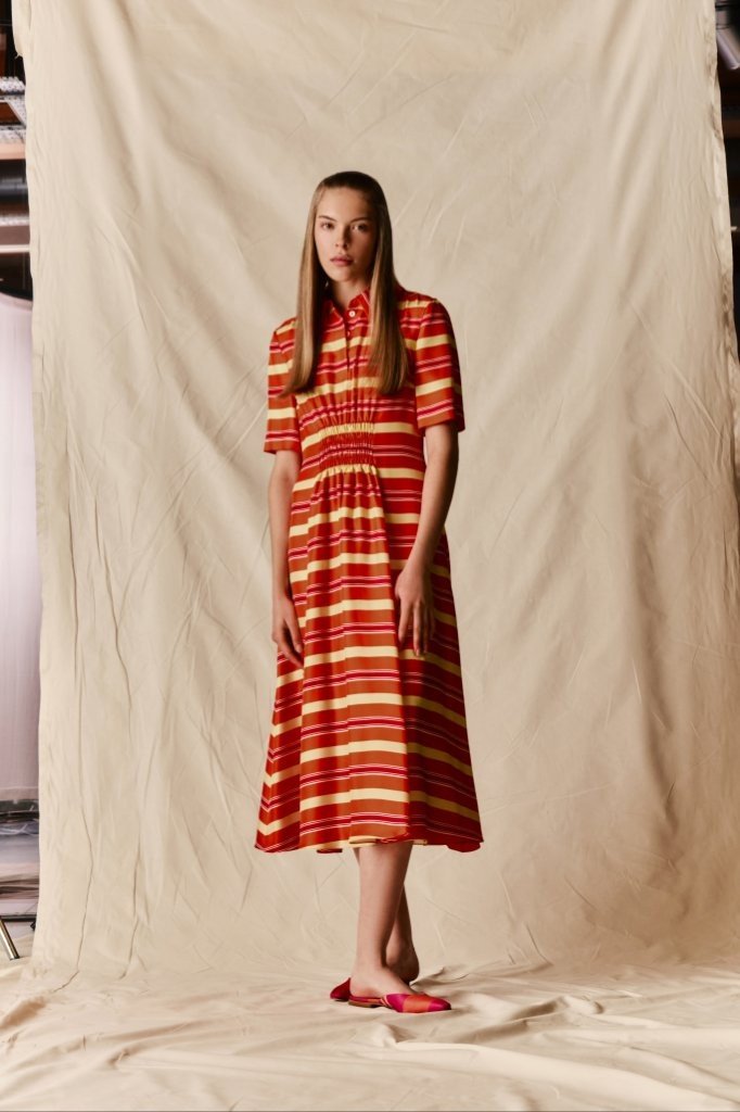 Fabrications balance structure with ease: sculptural Single Wool Crepe; crisp Cotton Poplin in bold Bayadère stripes; nonchalant denim; narrative Silk Twill prints; painterly Taffeta Faille; airy Textured Organza; and rich evening textures including Cloqué, Metallic Jacquard and Needle-Punch Satin.