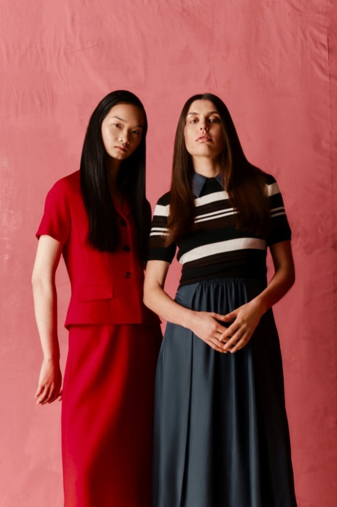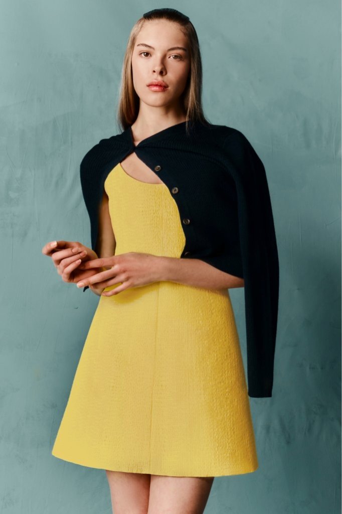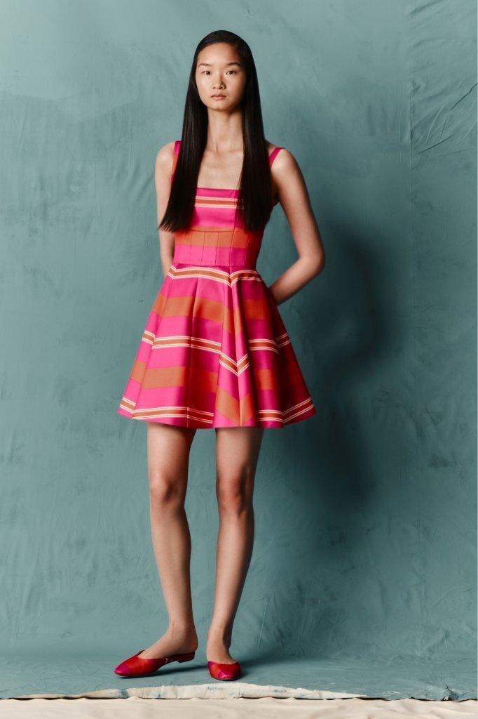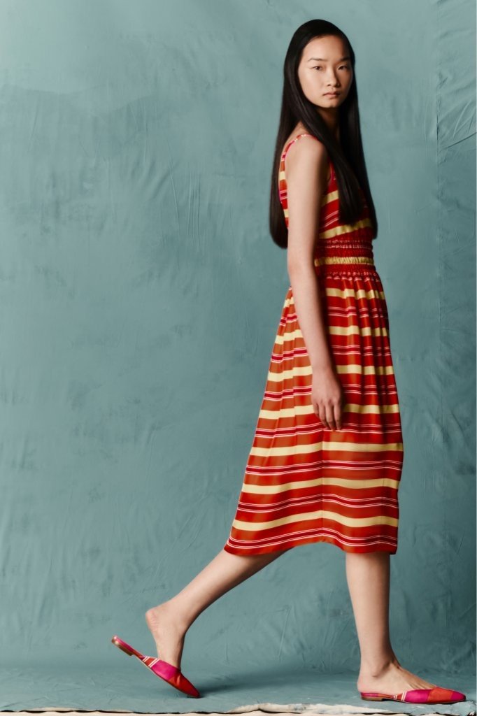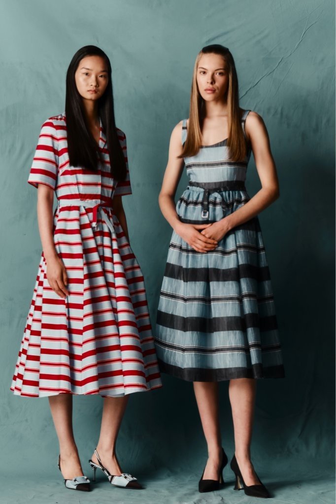 Fabrications balance structure with ease: sculptural Single Wool Crepe; crisp Cotton Poplin in bold Bayadère stripes; nonchalant denim; narrative Silk Twill prints; painterly Taffeta Faille; airy Textured Organza; and rich evening textures including Cloqué, Metallic Jacquard and Needle-Punch Satin.