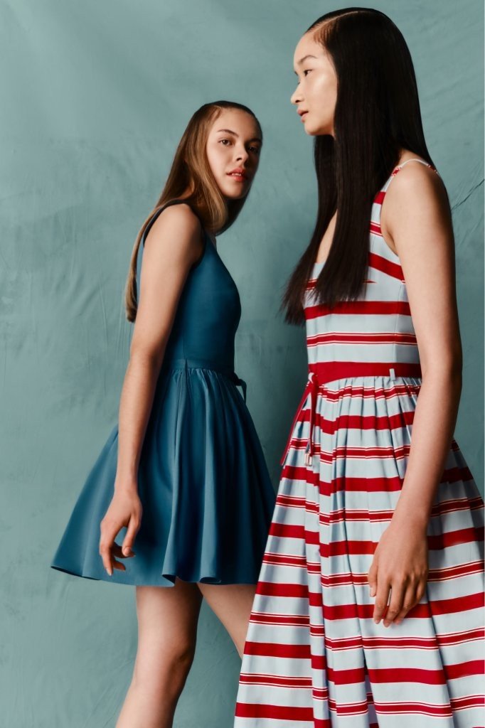 A Riviera-washed palette of sun-worn pink, icy blue, lemon, and soft neutrals contrasted with midnight, plum and chocolate is punctuated by vivid flashes of red, hot pink and orange. Stripes and florals appear with cinematic intention, echoing Cécile’s iconic wardrobe and the film’s visual language.