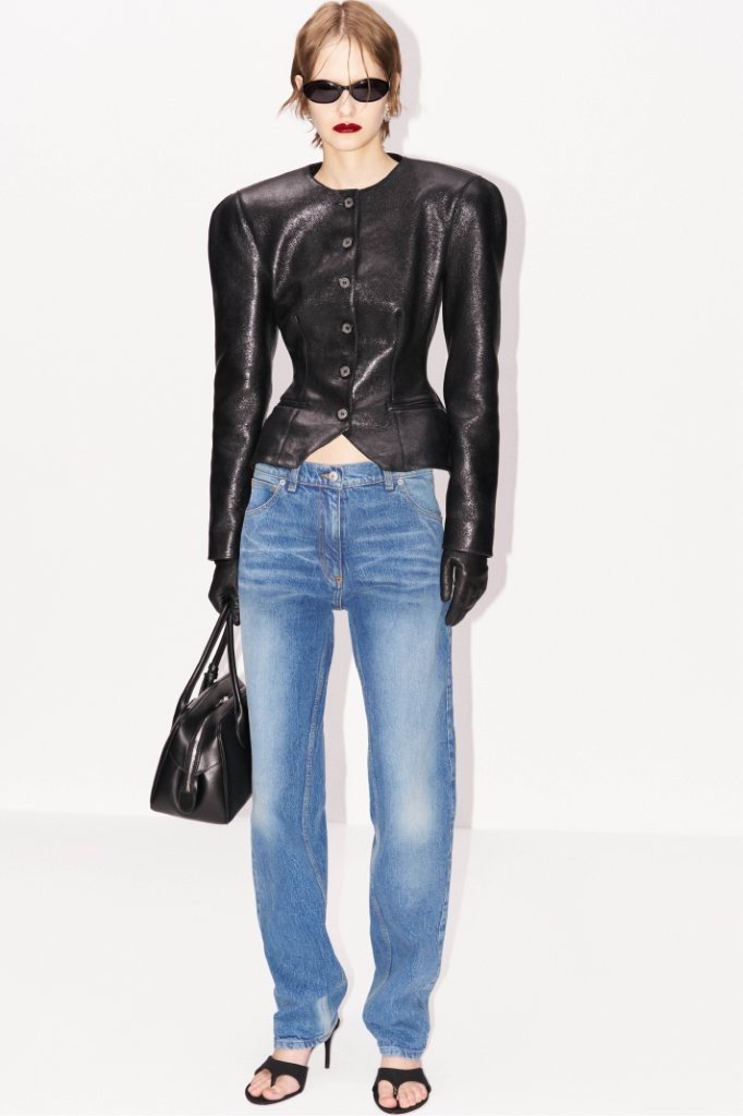 Denim, a house staple, reappears with a utilitarian yet unmistakably chic attitude. Vintage-inspired staples include faded straight-leg jeans and a coordinating shoulder-padded jacket with a cinched waist, reinforcing the collection’s structured femininity.