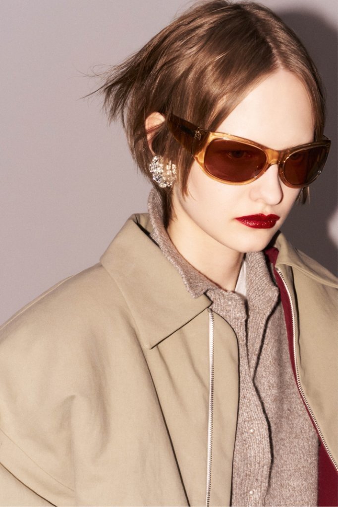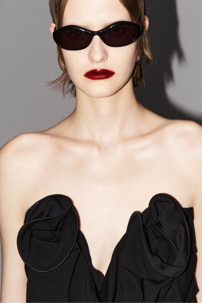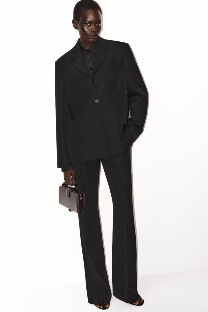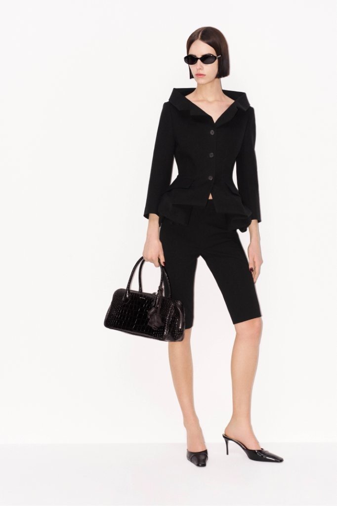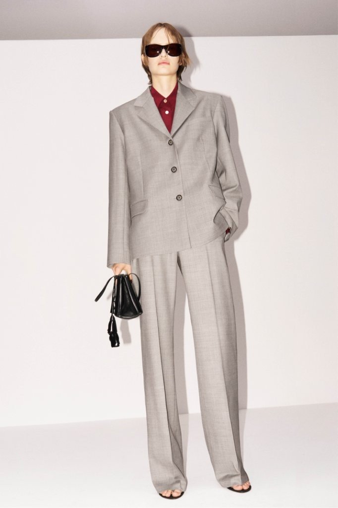 The collection’s tailoring is razor-sharp in both precision and cut. Anchored in Magda’s signature shaping, a cropped, fitted jacket with oversized shoulders returns in timeless wool crepe; its design language is echoed in a sculpted, sartorial long-sleeve top, tied at the back. A masculine-leaning, 1990s-inflected sensibility runs through boxy suits that mean business.