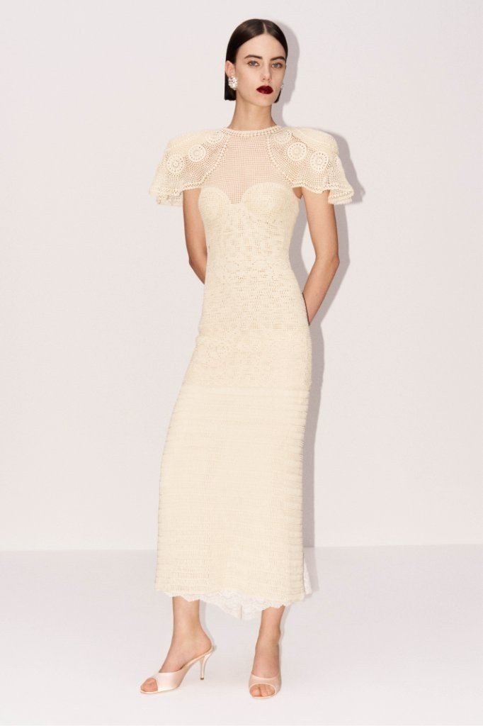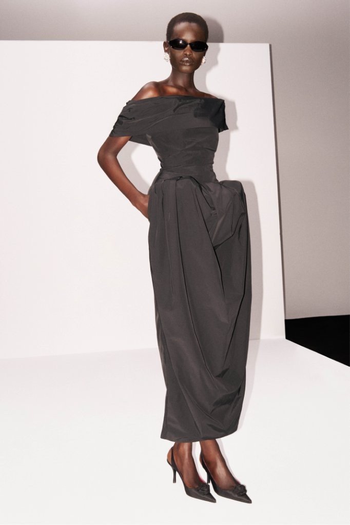 This season’s dresses possess a seamless day-to-night quality, most notably the little black dress, revisited in a new, billowy proportion that conveys effortless sophistication. Its shoulder-padded frame beams with attitude, while the emphasized waist channels feminine energy. Pre-Fall 2026 skirts play with proportion and scale. Panniered, mid-length silhouettes create an intriguing, body-morphing effect that feels both cheeky and highly elegant. That same debonair cool surfaces in a floor-grazing, densely ruffled skirt, blending classic regality with an urban edge. The pre-collection’s skirts carry forward the romantic mood of recent runway presentations.