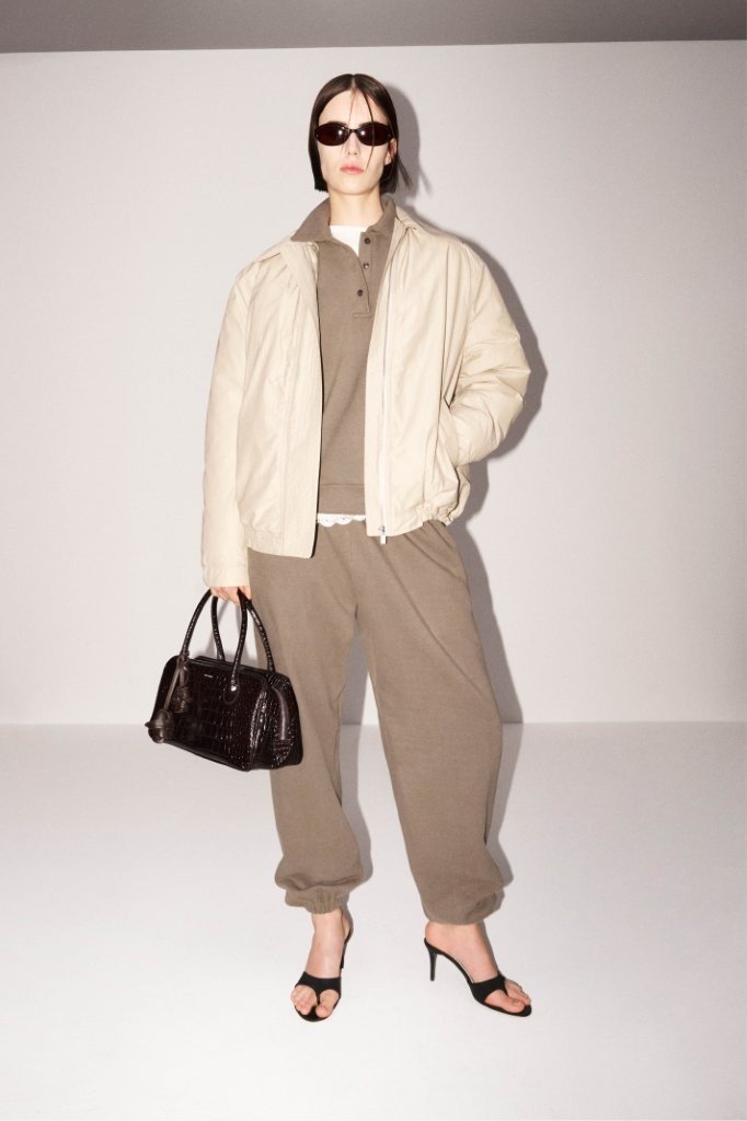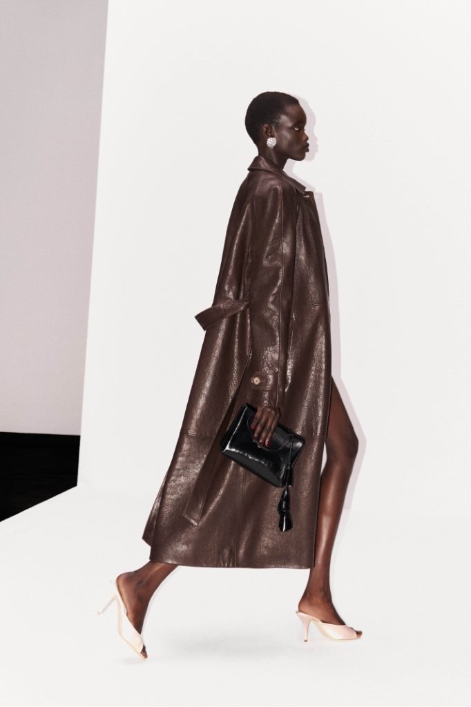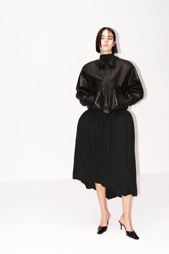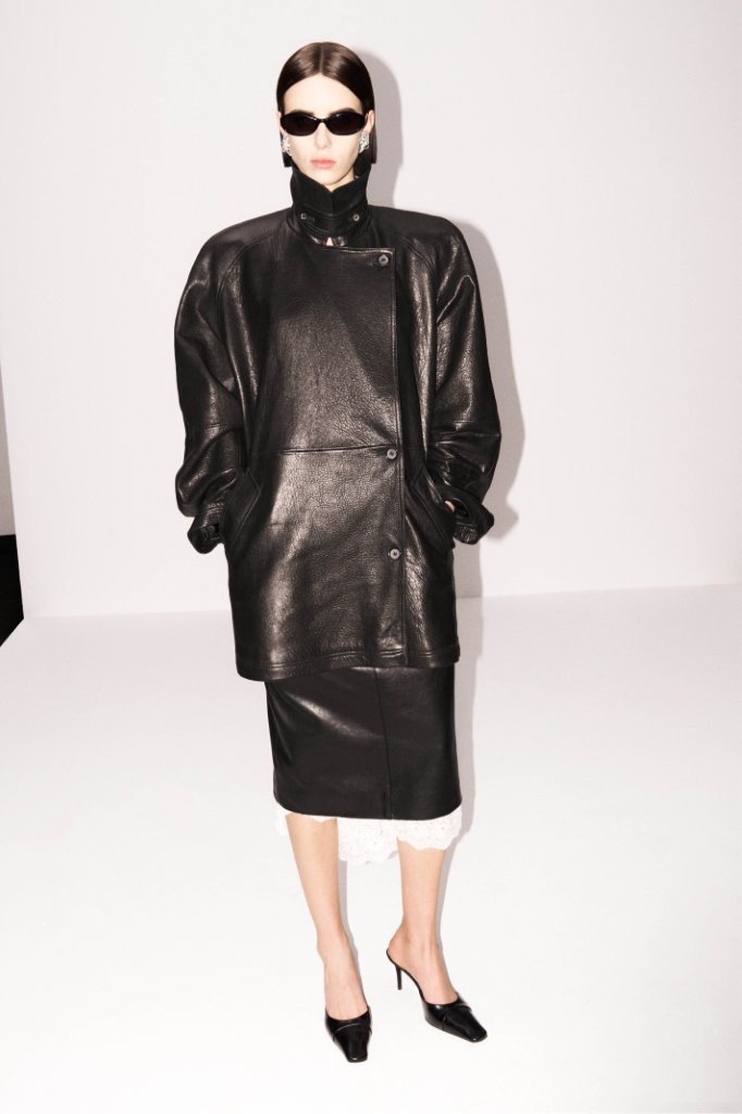 The pre-collection foregrounds investment-driven outerwear with enduring versatility. Leather is a key category this season, reworked into strong, saleable wardrobe essentials. Highlights include a cinched-waist biker jacket, an hourglass-shaped blazer, and a black, boxy, double-breasted leather coat with a deliberately lived-in finish. The collection also introduces a preppy accent via a beige, thick-cotton varsity jacket, offering flexible styling potential over knitted and crochet-trimmed separates with an urban slant.
