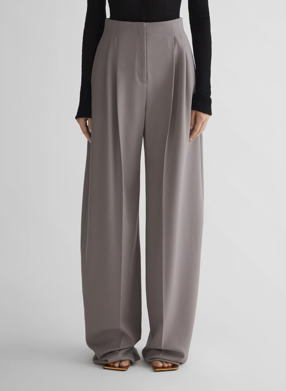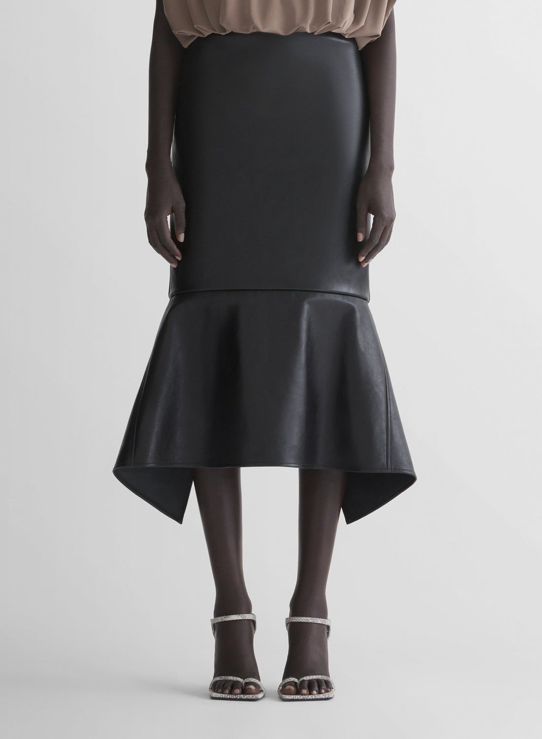 Minimalist second skin body suits with skirts exploding with feathers, or draped in a very mid-century couture manner; exaggerated nip-waist coats and dresses in black patent; and, a scrolled rosette motif on a rather fabulous black leather dress with next spring’s de rigeur off the shoulder décolleté, the neckline standing away from the body as if inflated outwards.